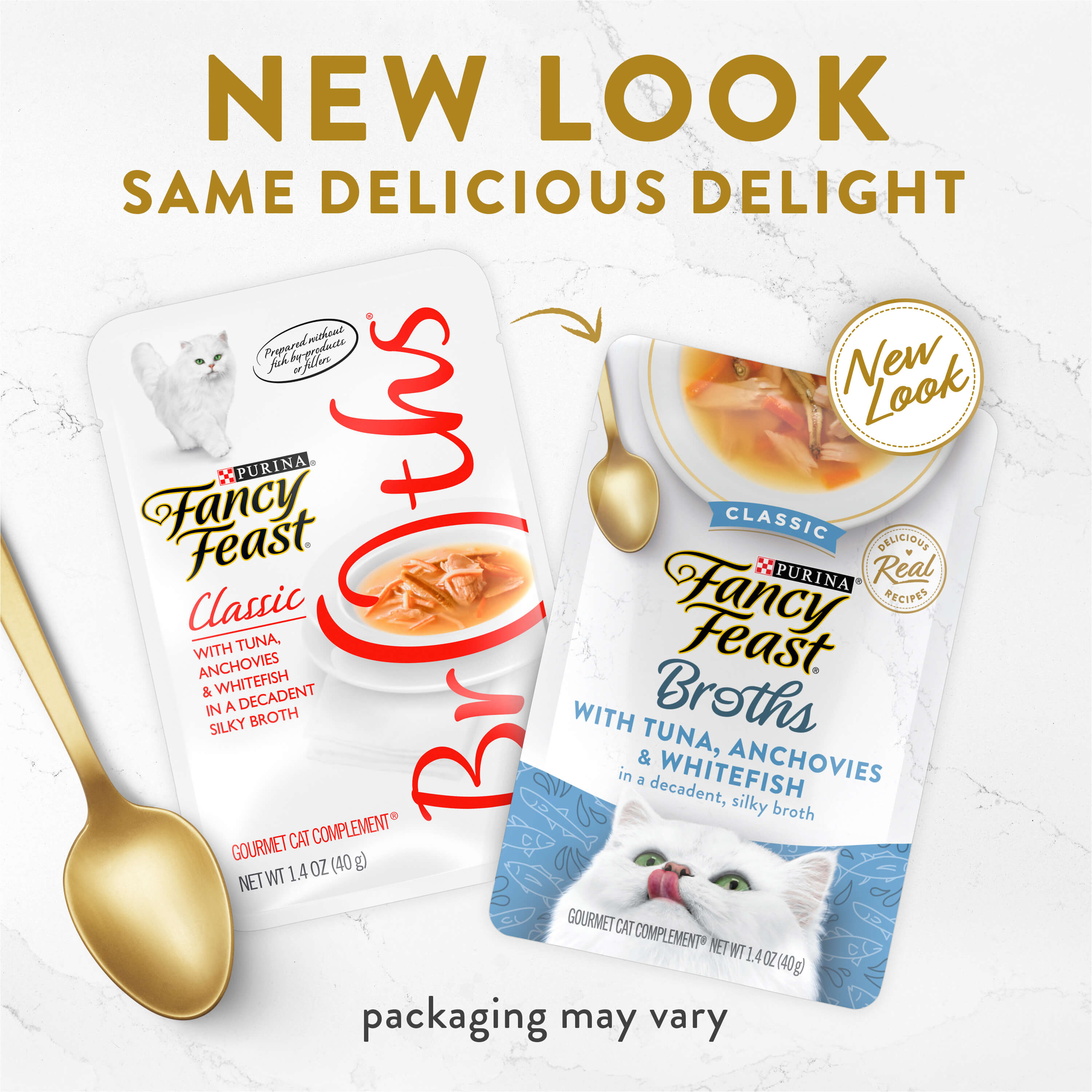 Create a gourmet dining experience for your cat with a Purina Fancy Feast Broths Classic With Tuna, Anchovies & Whitefish Gourmet adult cat food complement. Morsels of real tuna, anchovies and whitefish combine in this grain free wet cat food mixer to offer the delicate seafood flavors cats love, and the decadent, silky broth for cats will have her lapping up every last mouthwatering drop.