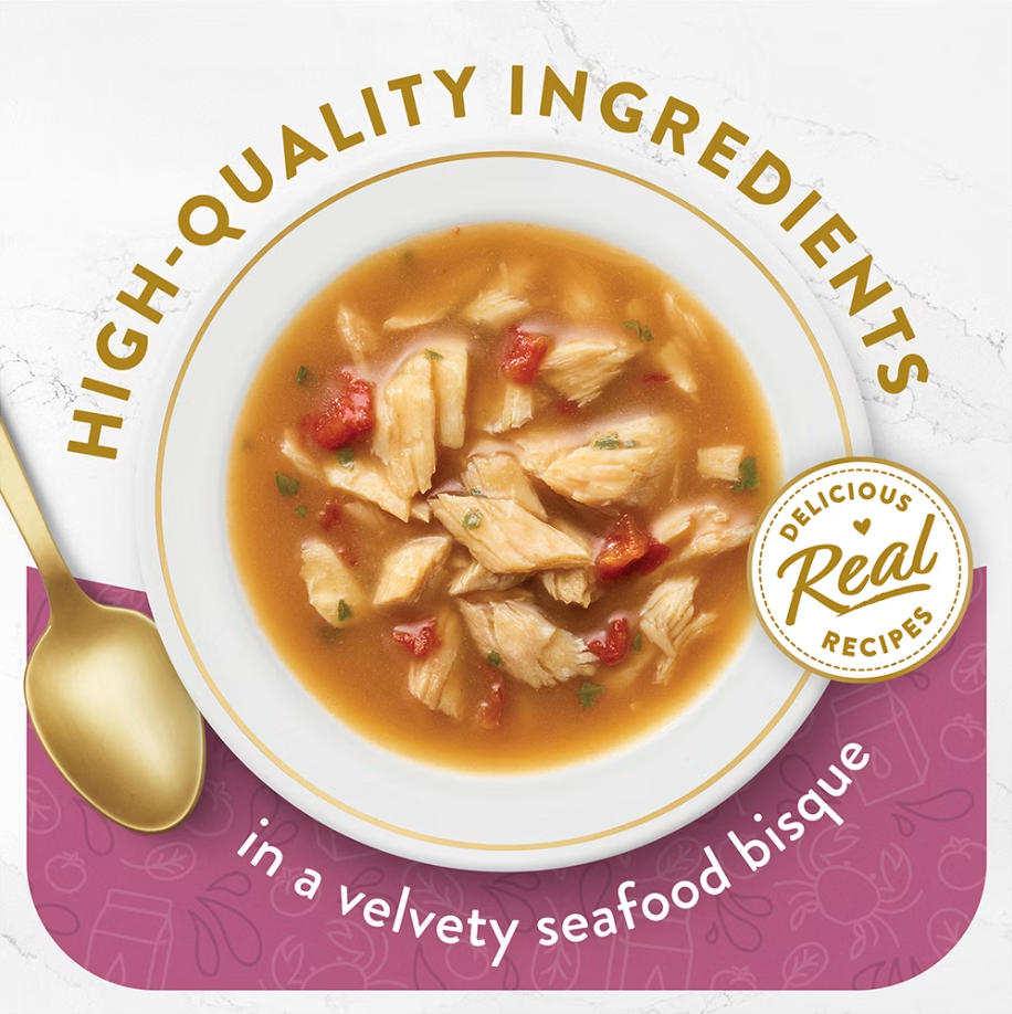 Create a gourmet dining experience for your cat with a Purina Fancy Feast Broths Classic Seafood Bisque and Accents of Real Crab Gourmet adult cat food complement. Morsels of real seafood and crab combine in this grain free wet cat food mixer to offer the delicate flavors of broths cats love, and the decadent, silky broth for cats will have her lapping up every last mouthwatering drop.