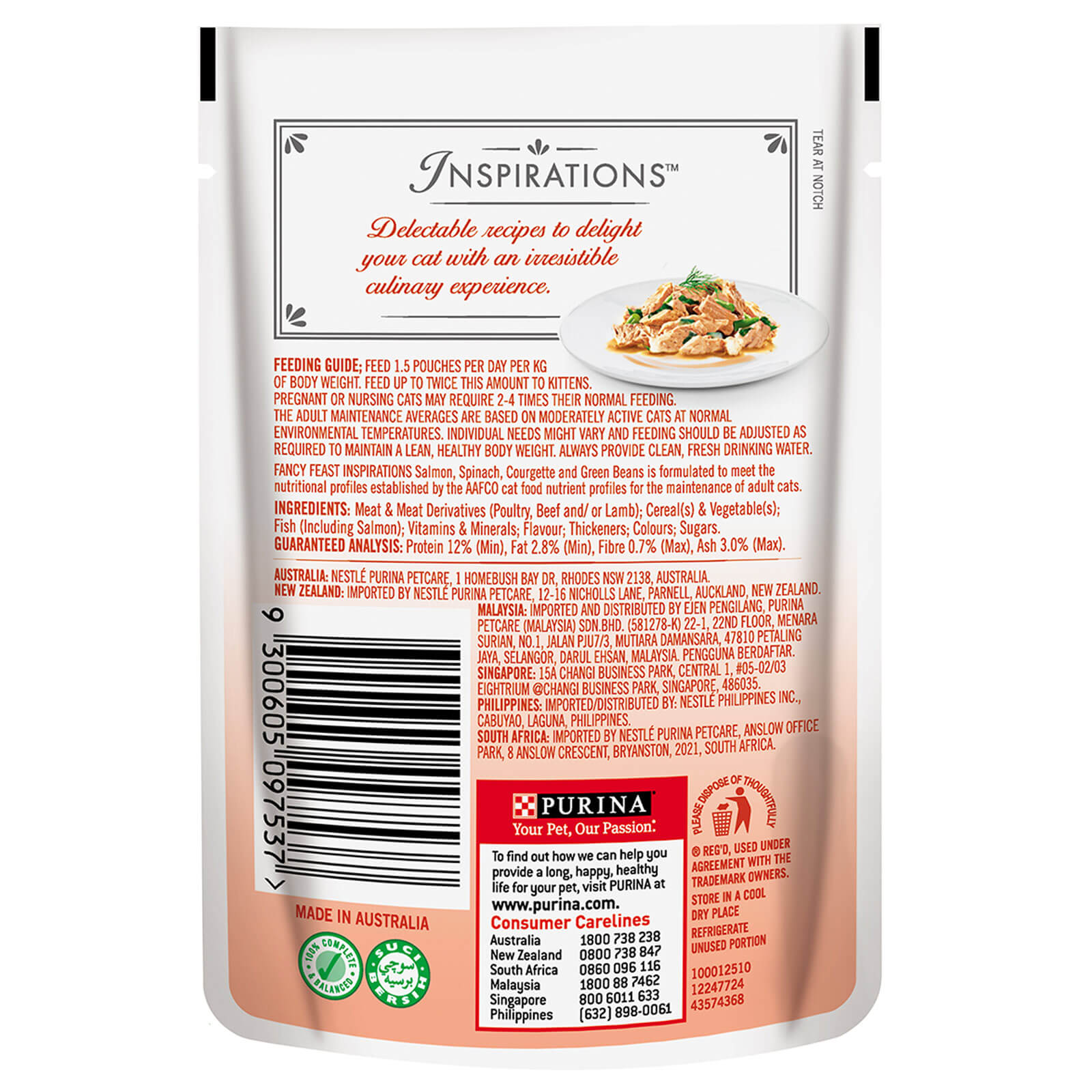 FANCY FEAST INSPIRATIONS Salmon, Spinach, Courgette and Green Beans contains fine, delicate cuts of salmon combined with carefully selected ingredients including spinach, courgette and green beans.