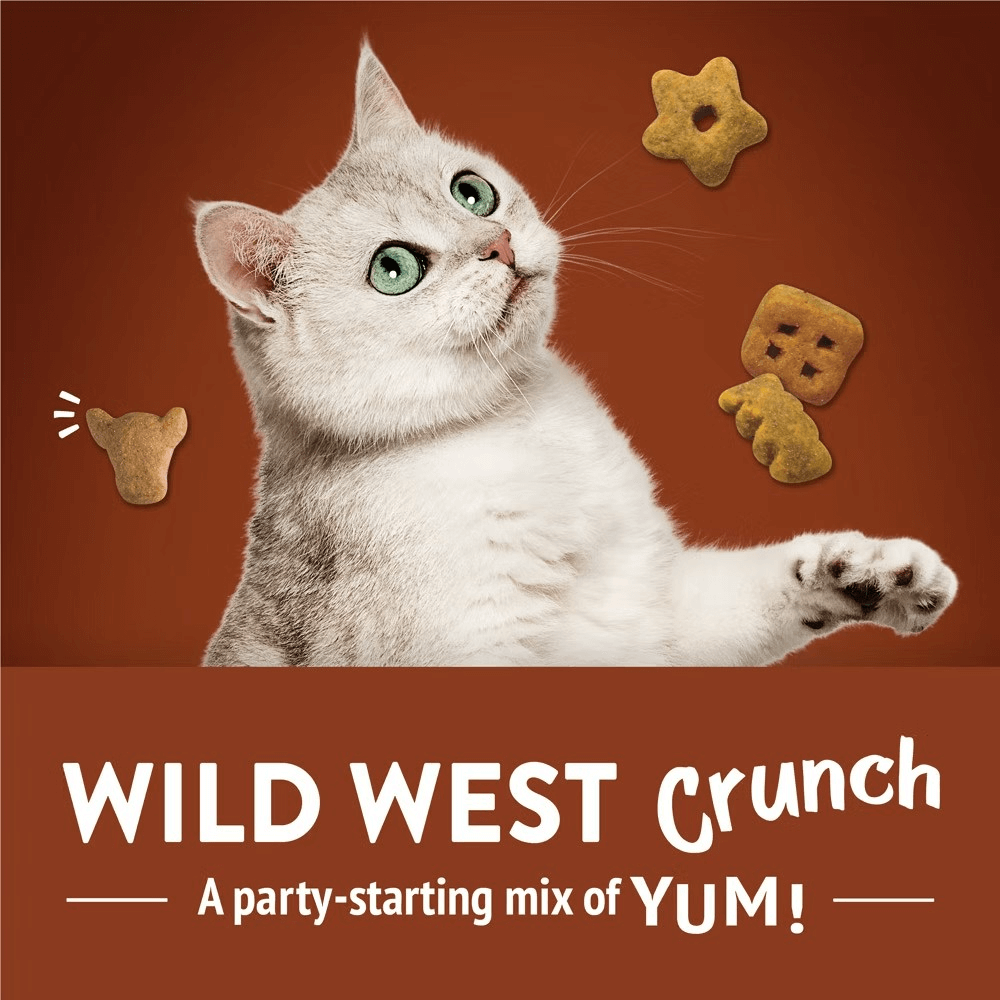 Yee haw! Round up three whisker-licking flavors with Purina Friskies Party Mix Wild West Crunch adult cat treats. There's a showdown of yumminess in every package, this awesome treat is like a stampede of deliciousness with the flavors of beef, liver and cheddar!