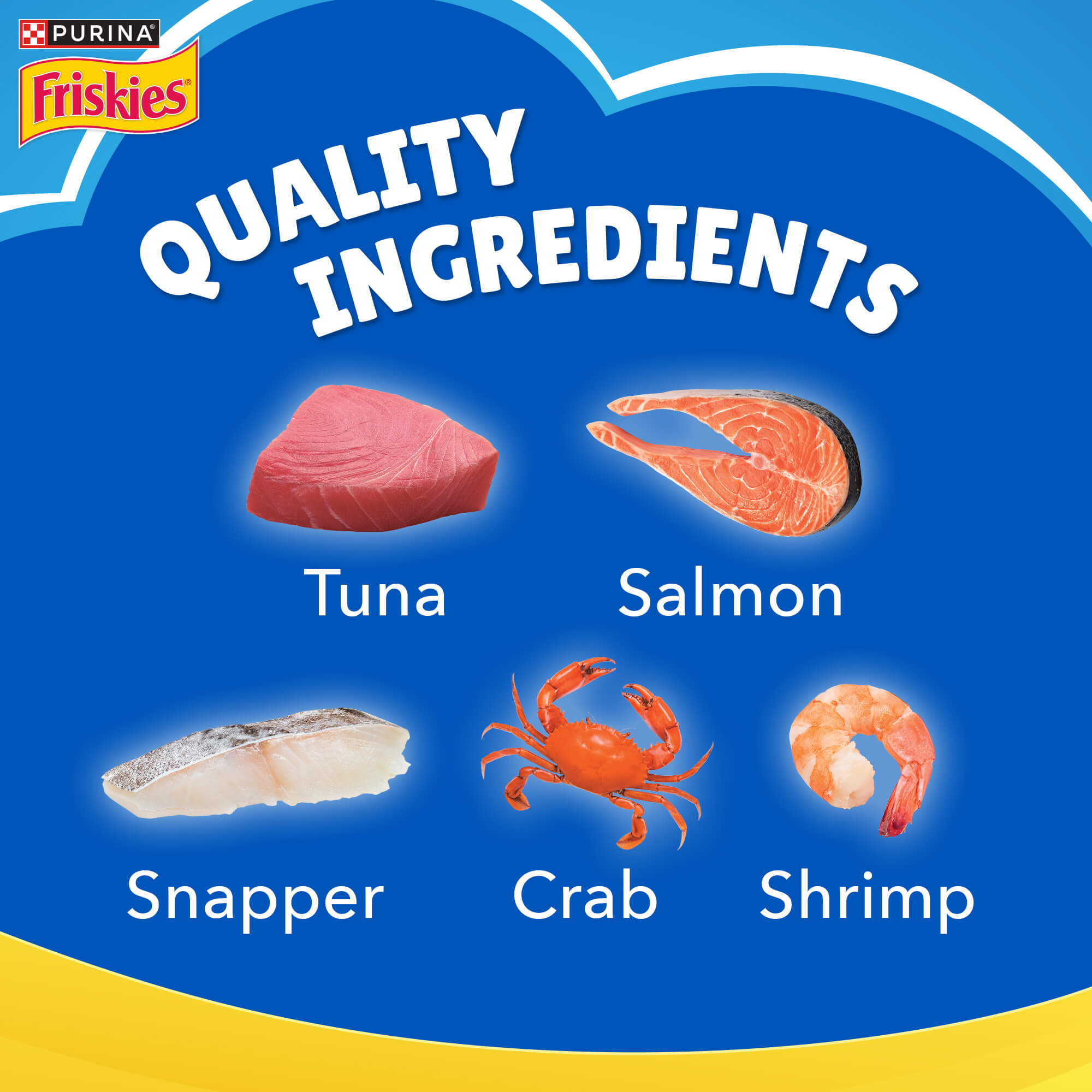 FRISKIES Seafood Sensations® offers a delectable blend of Tuna, Salmon, Snapper, Crab and Shrimp, creating an irresistible feast for cats who adore seafood. This delightful meal is brimming with the mouthwatering goodness of the sea!