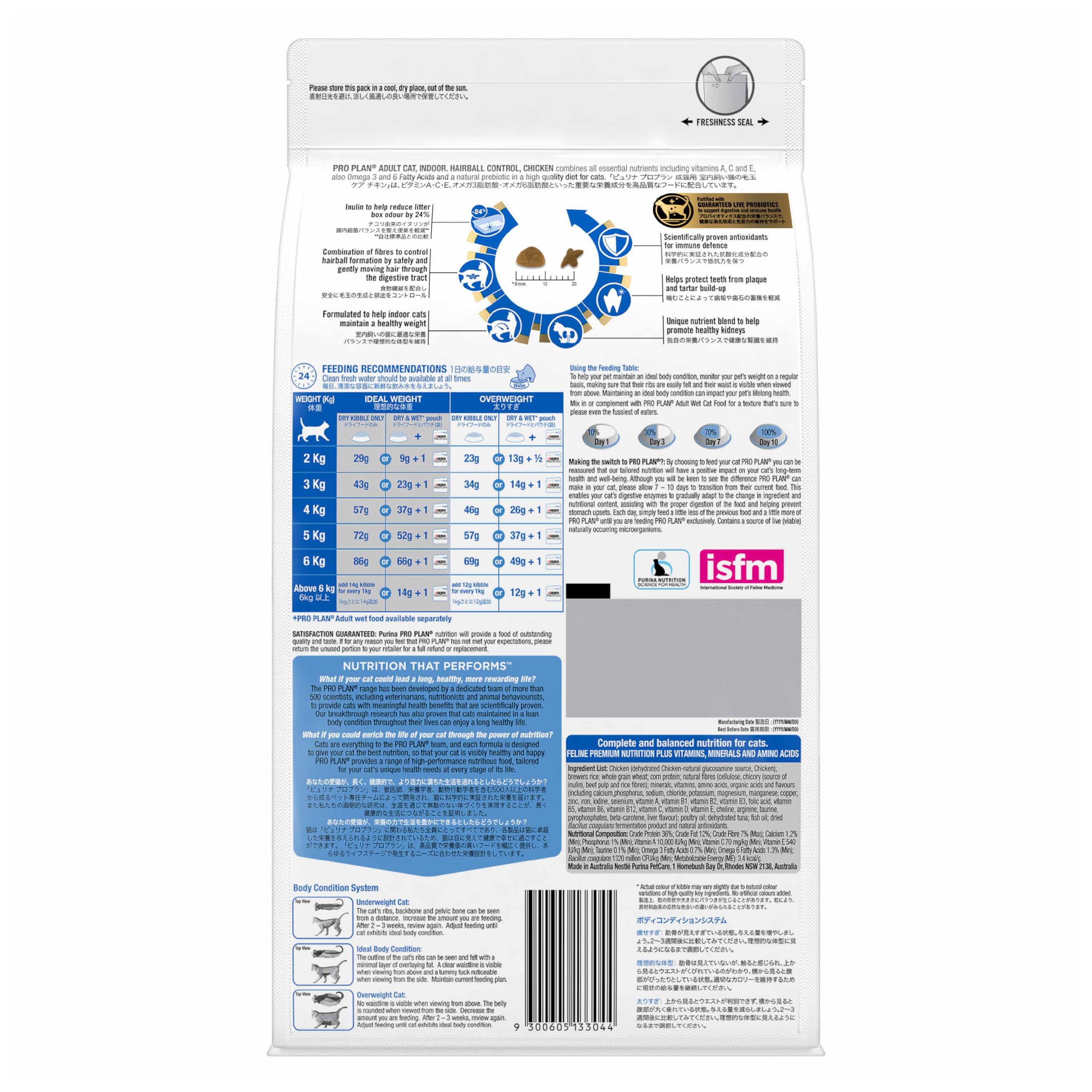 PRO PLAN® ADULT CAT, INDOOR. HAIRBALL CONTROL, CHICKEN combines all essential nutrients including vitamins A, C and E, also Omega 3 and 6 Fatty Acids and a natural prebiotic in a high quality diet for cats. It contains inulin to help reduce litter box odour, a combination of fibres to control hairball formation and a unique nutrient blend to promote healthy kidneys. Furthermore, it is fortified with guaranteed live probiotics to support digestive and immune health.
