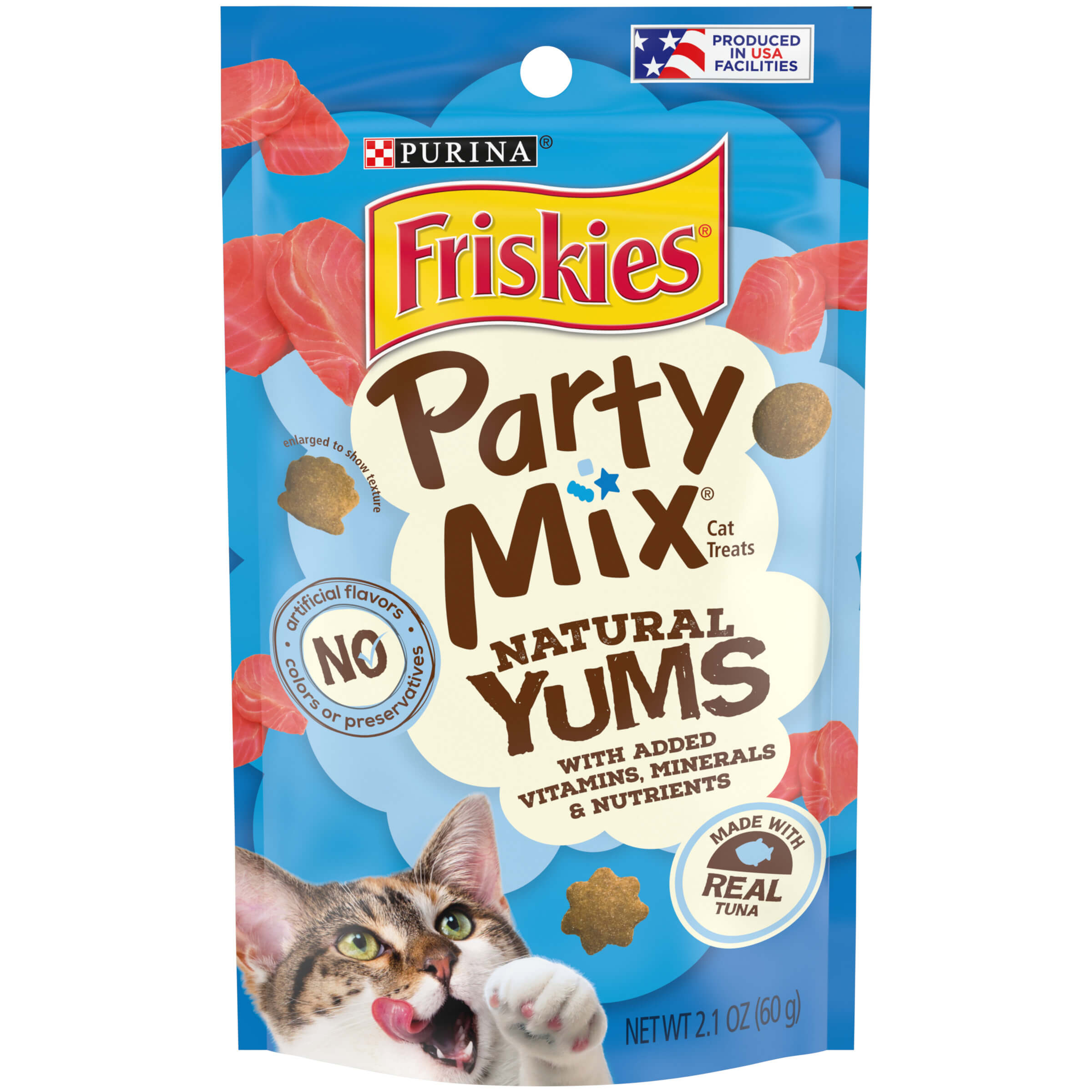 The tasty crunch of Party Mix has gone natural! Friskies Party Mix Natural Yums cat treats are carefully crafted with real tuna, accents of sunflower & garden veggies, and a blend of vitamins, minerals & nutrients. Every naturally tasty bite is free of artificial flavors, colors and preservatives. Not to mention, that at only 2 calories per treat, they’re perfect for guilt-free snacking, with the 100% complete and balanced nutrition your cat deserves. Treat your feline friend right with the tasty crunch of Party Mix Natural Yums. Made with Real TunaNo Artificial Flavors, Colors or PreservativesNatural Recipe with Added Vitamins, Minerals & NutrientsAccents of Sunflower & Garden Veggies