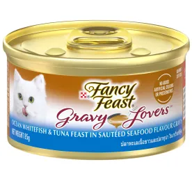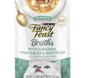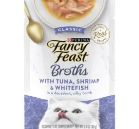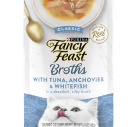 Create a gourmet dining experience for your cat with a Purina Fancy Feast Broths Classic With Tuna, Shrimp & Whitefish Gourmet adult cat food complement. Morsels of real tuna, shrimp and whitefish combine in this grain free wet cat food mixer to offer the delicate seafood flavors cats love, and the decadent, silky broth for cats will have her lapping up every last mouthwatering drop. We make our cat food toppers with real, recognizable ingredients you can see and no artificial flavors, colors or preservatives, so you can feel good about offering them to your cat. With the unmistakable taste and tender texture your cat craves, this simply crafted premium liquid cat food broth is a true feast for her senses. Serve a pouch of this delectable gourmet grain free cat food topping as an addition to her complete and balanced adult cat food diet. Watch as she delights in the lickable, savory broth and real, high-quality tuna, shrimp and whitefish found in every bite. Made with tender bites of real seafoodNo artificial colors, flavors or preservativesCrafted without by-products or fillersServe as a complement to your cat’s favorite meal