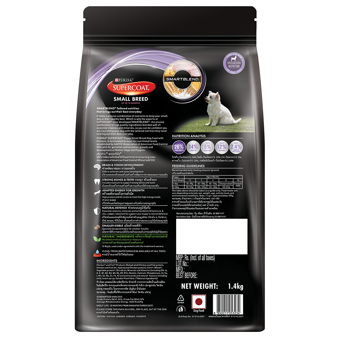 SUPERCOAT® Puppy Small Breed Chicken Dry Dog Food provides tailored nutrition specially formulated for Small Breed Dogs. Developed with Smartblend® technology, a precise combination of high-quality ingredients blended with 21 essential vitamins & minerals to cater to the unique needs of small dogs. SUPERCOAT® contains higher* protein & fat levels to keep up with small dogs' high metabolism level, formulated with calcium for stronger bones and teeth and is sized perfectly to suit their small jaws. No added artificial colours or flavours.